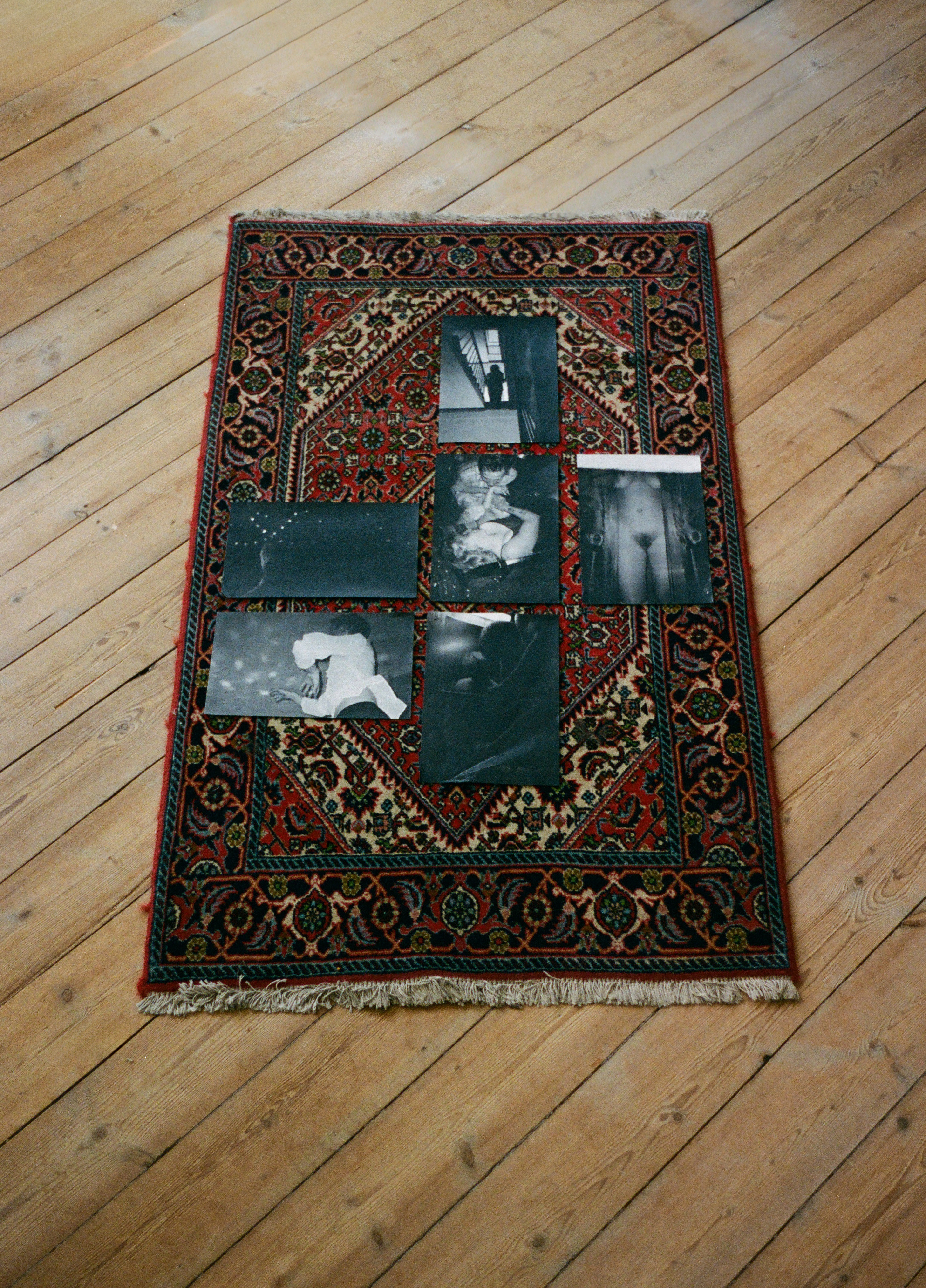 Nu skal vi heller ikke snakke problemerne frem, 2025, 90x130 cm, 20x28,7 cm, fotokopier på persisktæppe